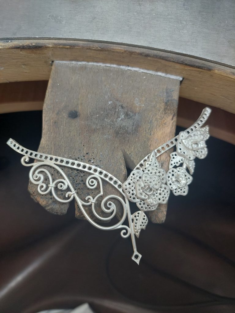 Dans mon entreprise, je commence le boulot à 7h30 tous la semaine. Une fois que j’ai récupéré mes pièces en cours et que je me suis enregistrée sur notre logiciel de pointage des heures, je me mets au travail et effectue toutes les taches à accomplir : reprise de fonte, brasures, montages des éventuels systèmes, contrôles conformités… Quand cela est fait je les envoie aux polisseurs, sertisseurs, à la gravure… afin de suivre le processus de production mis en place pour chaque bijou. Nous travaillons tous la main dans la main afin d’assurer la qualité des pièces. Enfin, je termine ma journée à 17h.